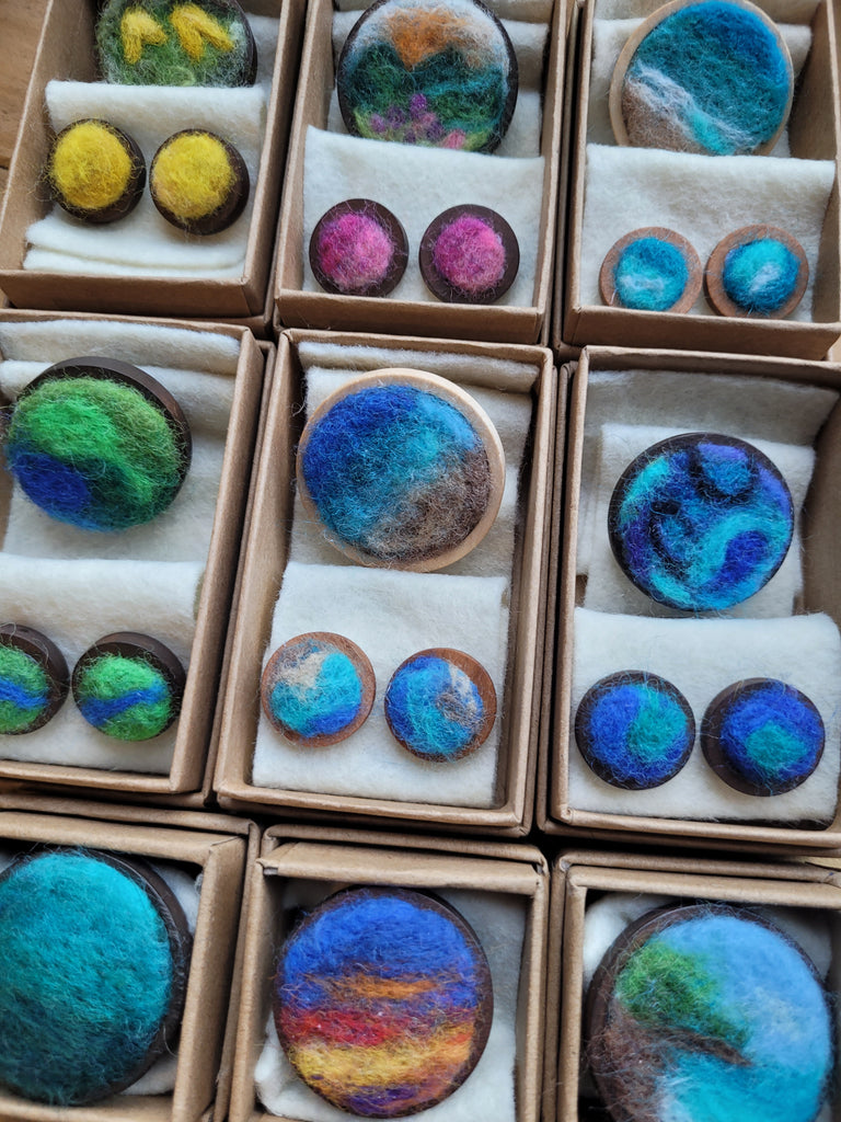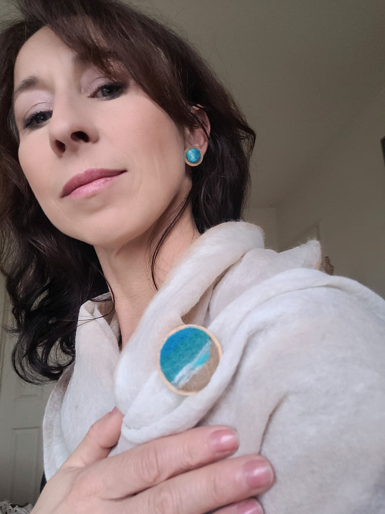 Ocean Landscape in Miniature – Needle Felted Earrings & Brooch. Merino wool on Wooden Base