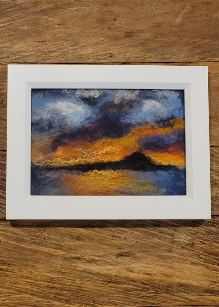 Wool & Silk Painting – Sunrise over Rangitoto Island, Nuno Felted Landscape, Framed Textile Art