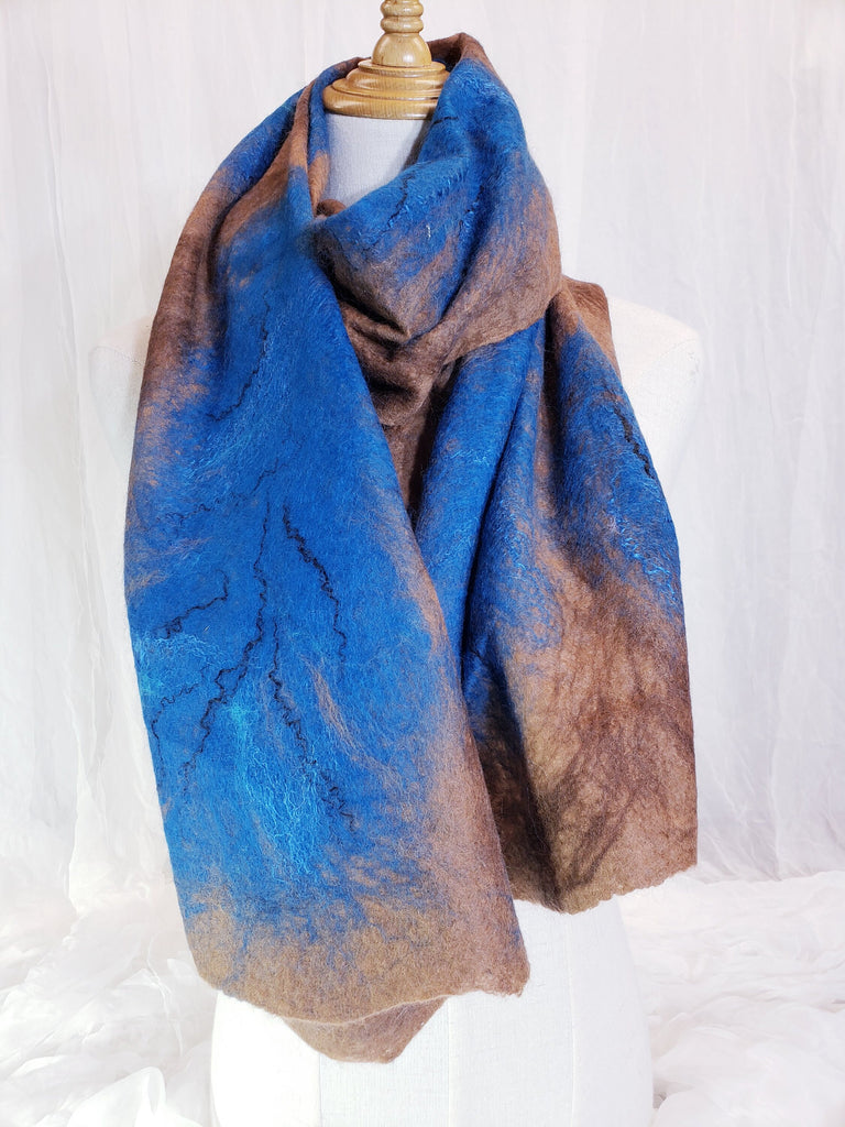 Nuno felted Scarf is warm and pleasant to the skin. The unique combination of the best silk and wool creates this wonderfully gentle velvet texture. The scarf is eco-friendly and versatile, gives a variety of choices on how to wear it - you may use it as an evening shawl with a dress or every day with a coat or shirt.