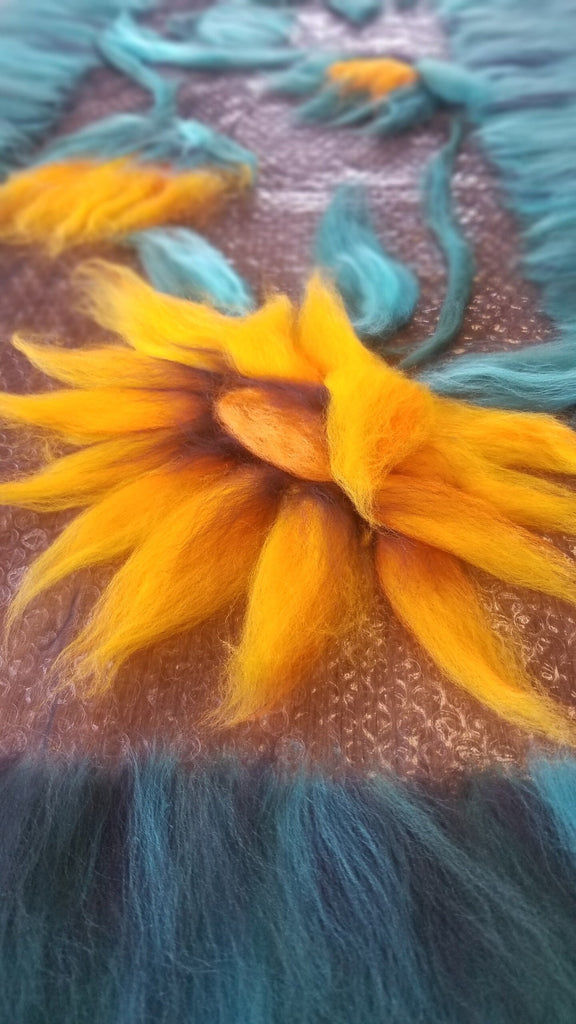 The pattern is laid on natural silk using various colors of soft wool, the whole thing is rubbed in water with Marseille soap so a long until wool fibers pass through the silk and join together.