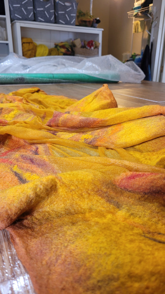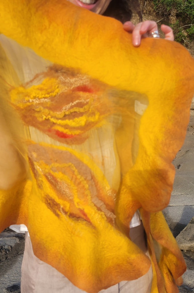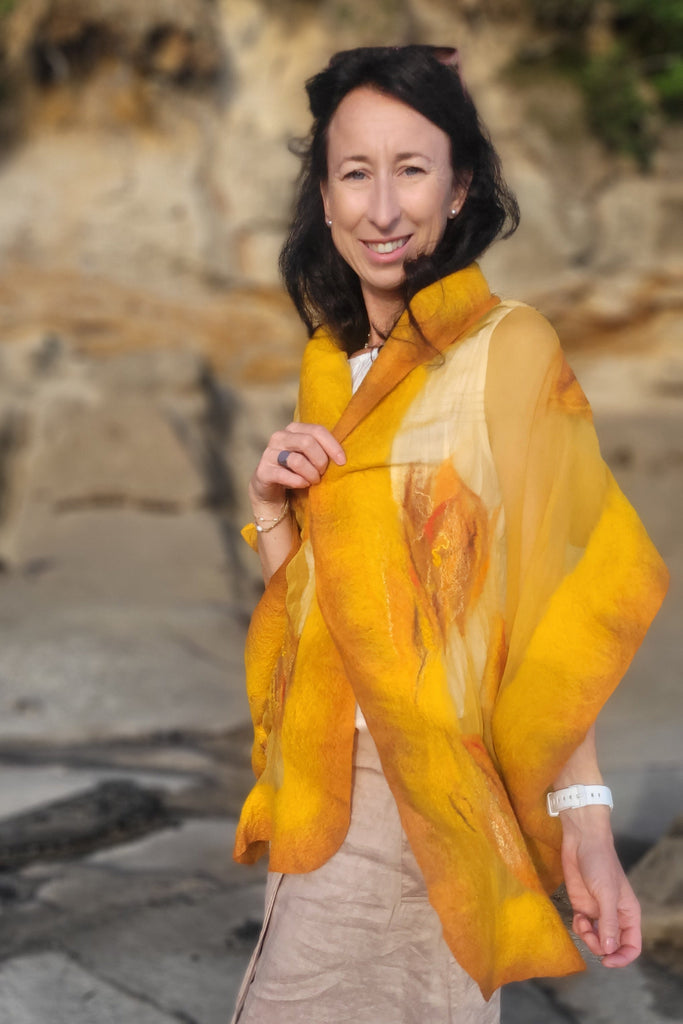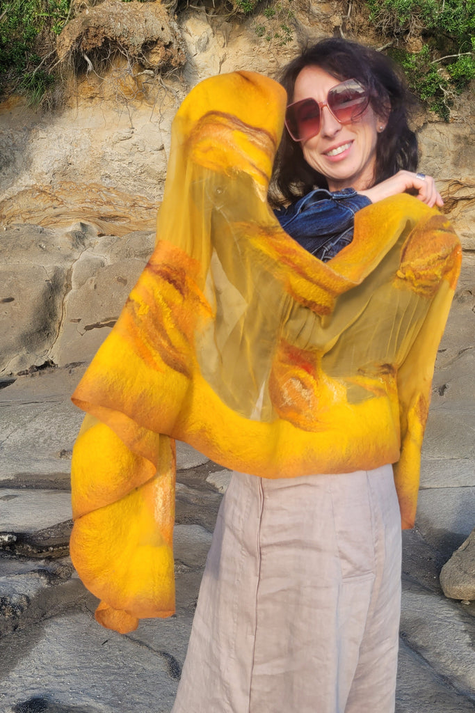 This large handcrafted shawl in glowing honey gold and warm amber tones is made from premium extra fine merino wool and pure chiffon silk. Light, breathable and elegant, it works beautifully as an evening shawl, silk wrap, or artistic scarf for autumn, spring and summer nights.