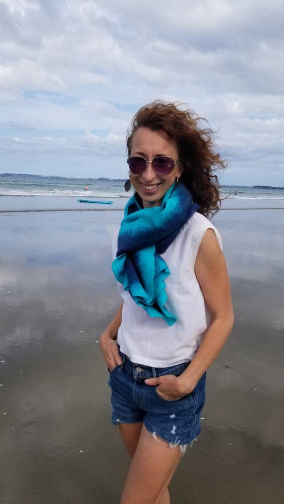 Nuno felted Scarf is warm and pleasant to the skin. The unique combination of the best silk and wool creates this wonderfully gentle velvet texture. The scarf is eco-friendly and versatile, gives a variety of choices on how to wear it - you may use it as an evening shawl with a dress or every day with a coat or shirt.