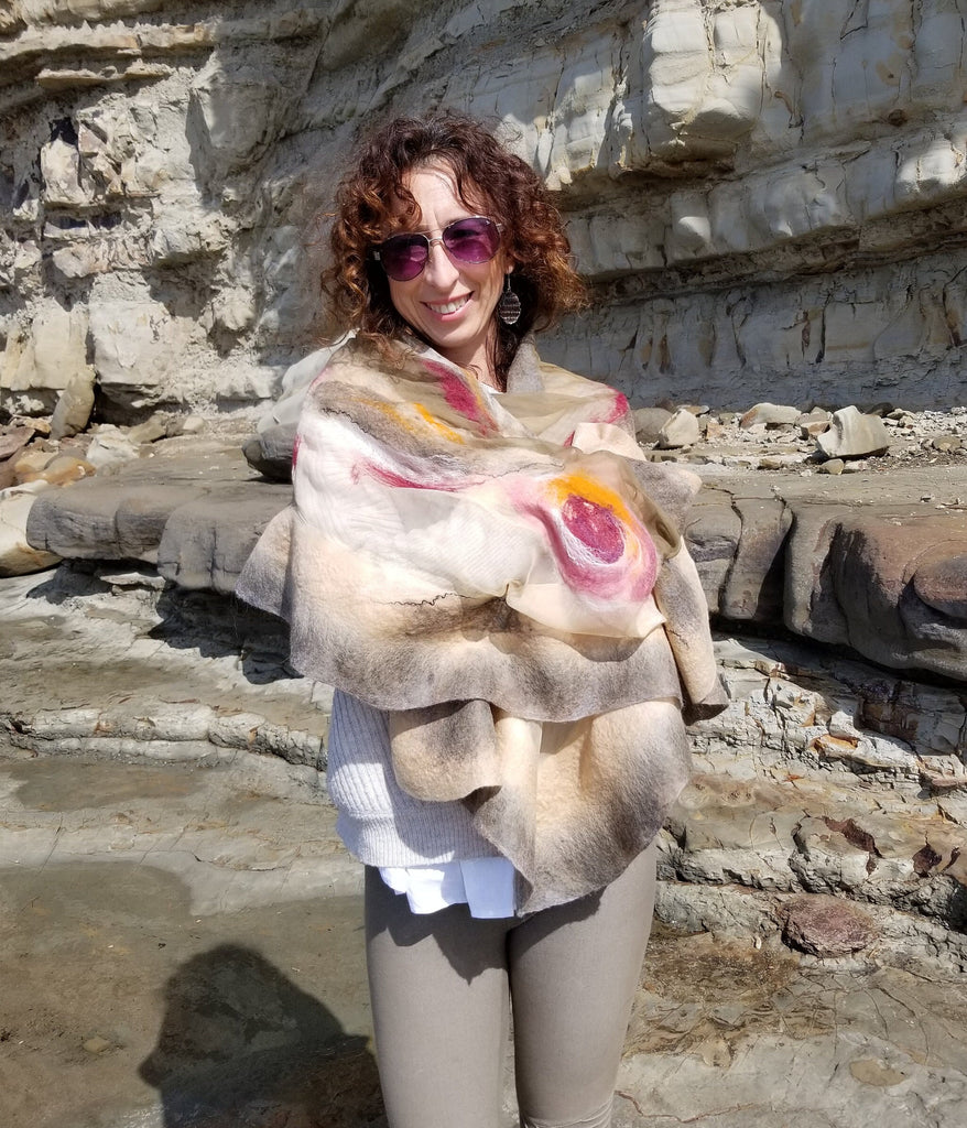 Nuno felted Scarf is warm and pleasant to the skin. The unique combination of the best silk and wool creates this wonderfully gentle velvet texture. The scarf is eco-friendly and versatile, gives a variety of choices on how to wear it - you may use it as an evening shawl, wedding with a dress, or every day with a coat or shirt.