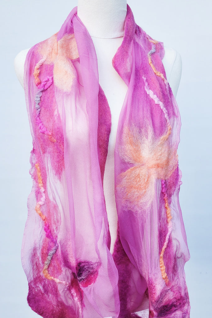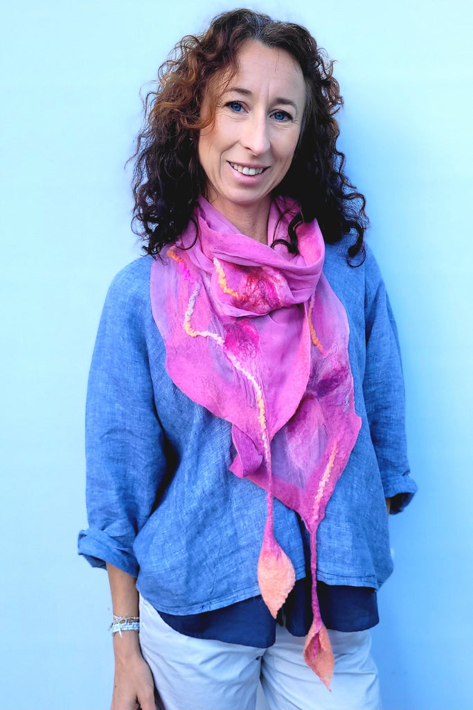 Working on pure chiffon silk, I blended premium extra fine merino wool with gentle, cascading calla-lily shapes along the shorter edges, creating a romantic, blooming frame around your shoulders. Shades of pink, coral, and peach move like warm sunlight — soft, joyful and beautifully feminine.