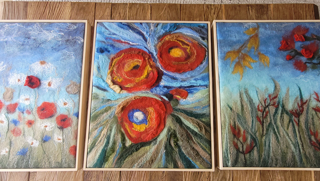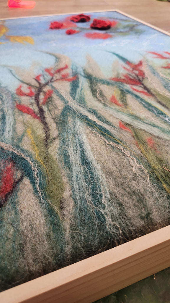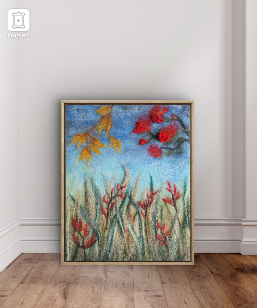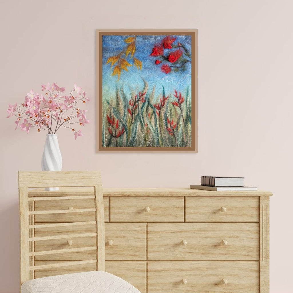 New Zealand Floral Wool Painting – Kōwhai & Pōhutukawa Wall Art, Textured Merino Wool & Silk Artwork, Nature Inspired Fiber Art