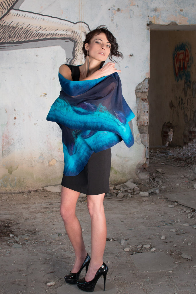 Nuno felted Scarf is warm and pleasant to the skin. The unique combination of the best silk and wool creates this wonderfully gentle velvet texture. The scarf is eco-friendly and versatile, gives a variety of choices on how to wear it - you may use it as an evening shawl, wedding with a dress, or every day with a coat or shirt.