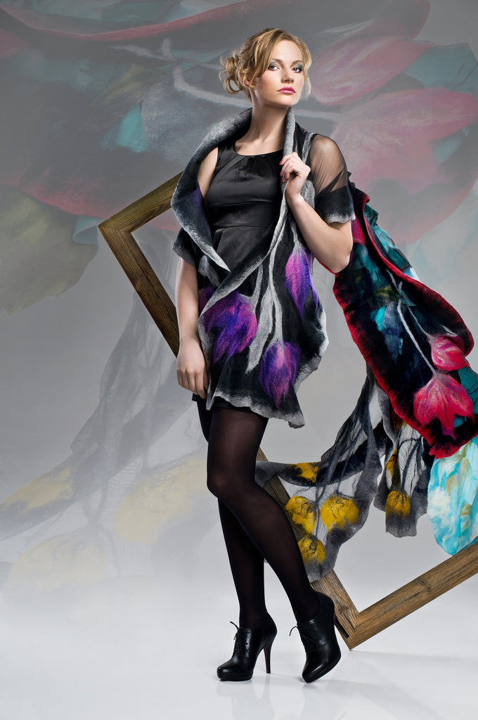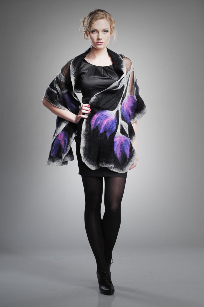 Purple and lilac tulips on shawl. Nuno felting merino & silk scarf fits to dress, evening.