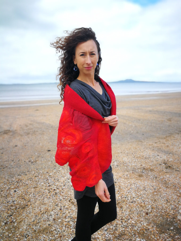 Red flowers shawl, scarf, cape, bolero, nuno felted on natural silk with merino wool, handmade in New Zealand