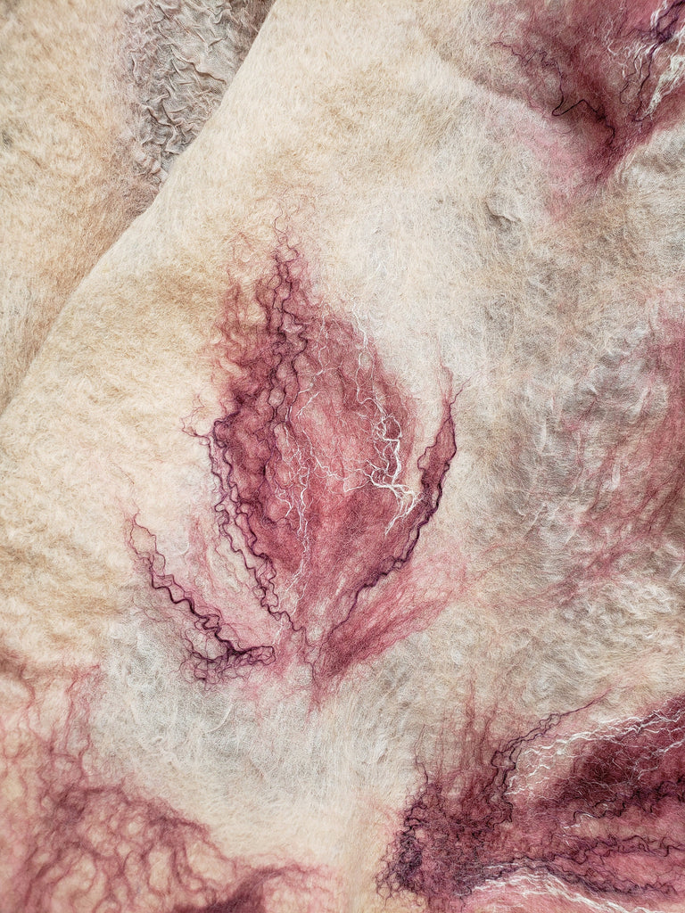 The pattern is laid on natural silk using various colors of soft wool, the whole thing is rubbed in water with Marseille soap so long until wool fibers pass through the silk and join together.