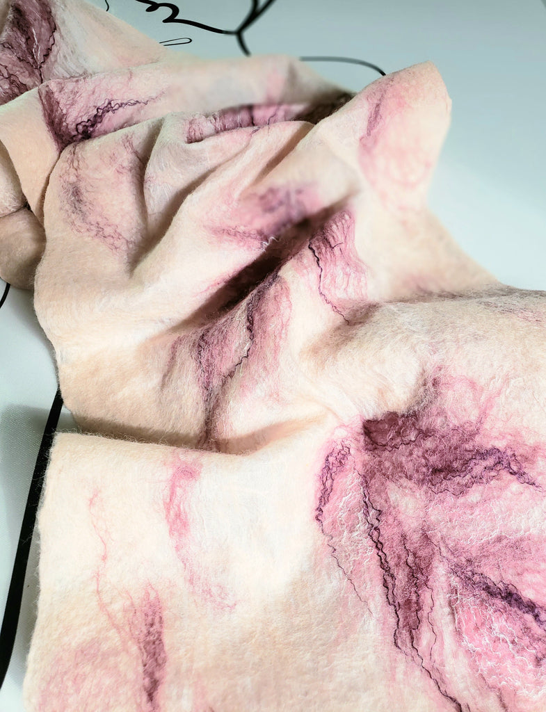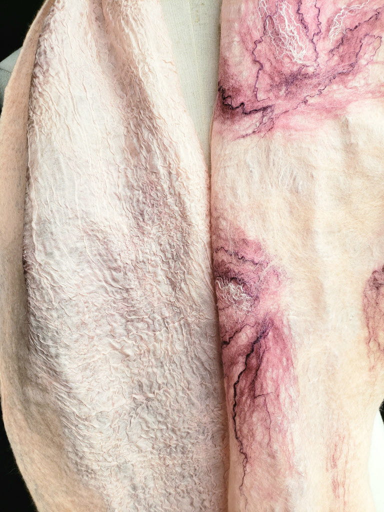 Scarf Pearl pink, peach, crinkled double-sided wool & silk, versatile wearableart. Goes well with white, beige, black shirt, jacket, dress.