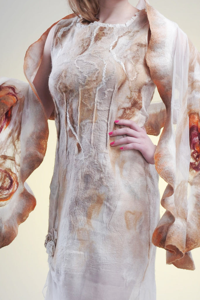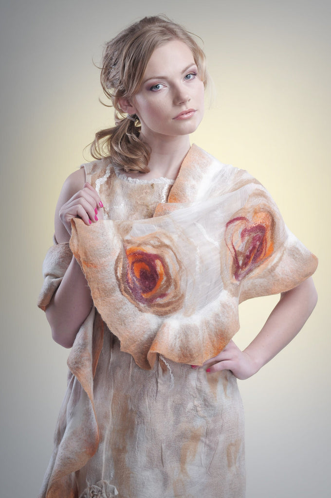 The impressive and elegant Nuno felted shawl is handmade from 100% highest quality merino wool and natural silk. The wrap goes well with an evening dress and wedding dress or casual with a coat, jacket, or T-shirt. The perfect and versatile accessory will be a flattering addition to any outfit, especially for bridesmaids, and brides in winter, fall, and brisk spring.