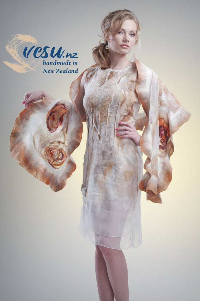My name is Agnieszka Arciszewska, my workshop is located in New Zealand, where I live currently. I come from Poland and that's where I started my adventure with creativity. I have been designing and creating for over 15 years. I use the thinnest merino wool and the highest quality natural silk, sometimes I reach for linen, cotton, or driftwood the pieces of wood which have been washed ashore, and everything that is natural and eco.