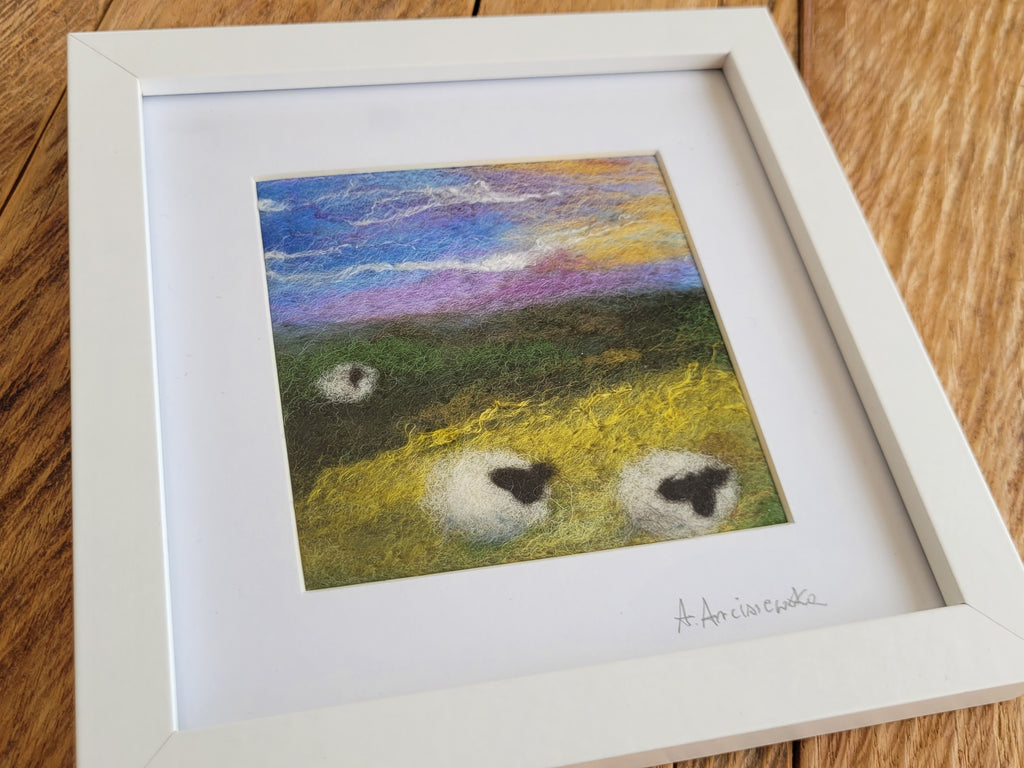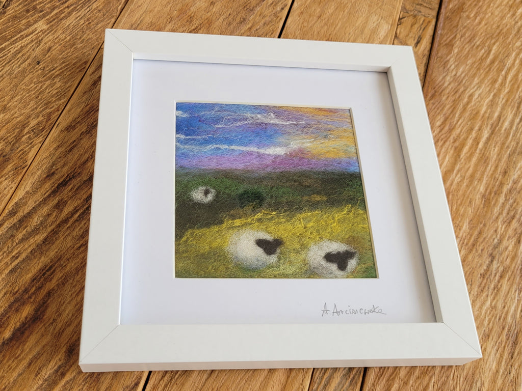 A handcrafted needle-felted wool painting made from soft merino wool and silk fibres, capturing a peaceful New Zealand landscape with grazing sheep.