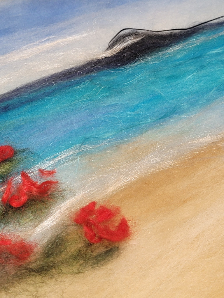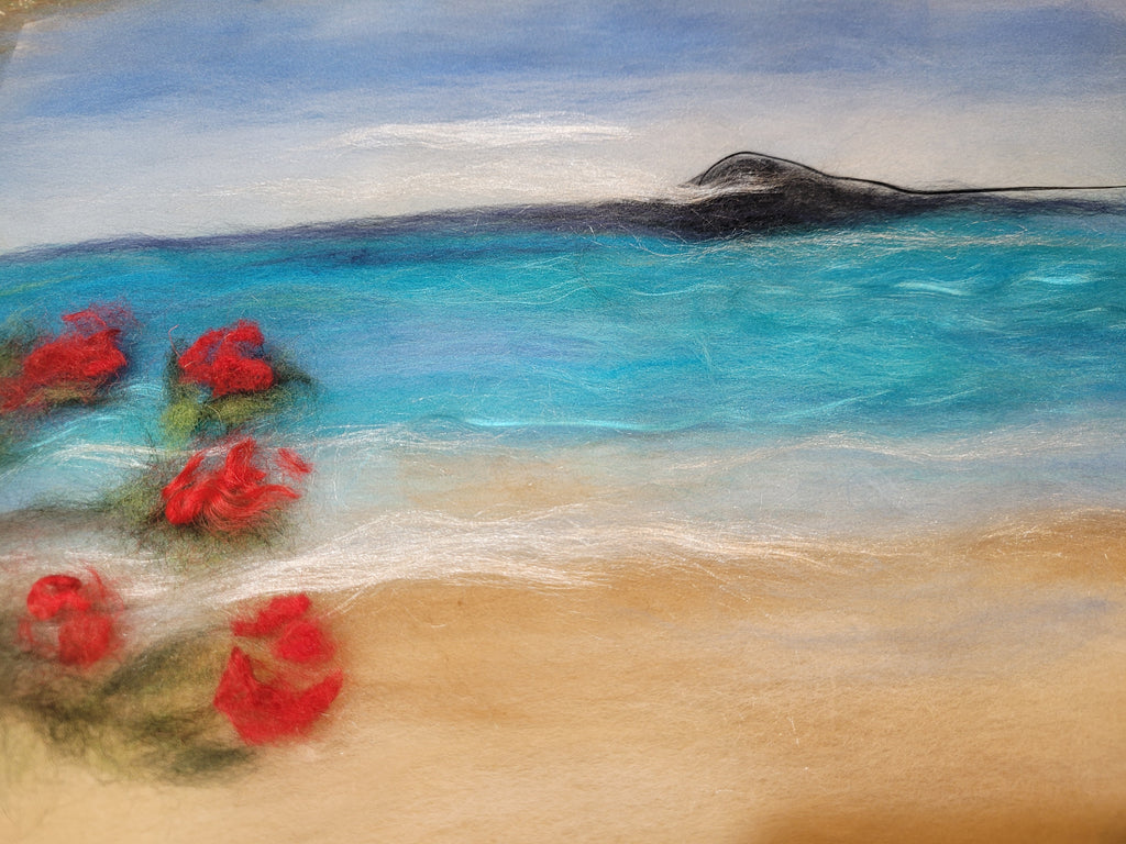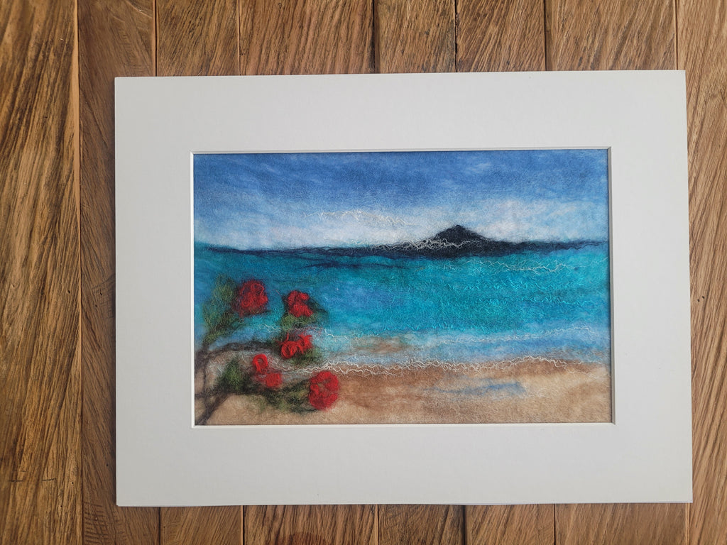 A dreamy summer moment from Auckland’s North Shore — turquoise waves, warm sand, Rangitoto resting on the horizon… and the vibrant red bloom of the pōhutukawa, New Zealand’s beloved “Christmas tree.” I handcrafted this piece using soft merino wool and shimmering mulberry silk to capture the magic of a Kiwi summer day.
